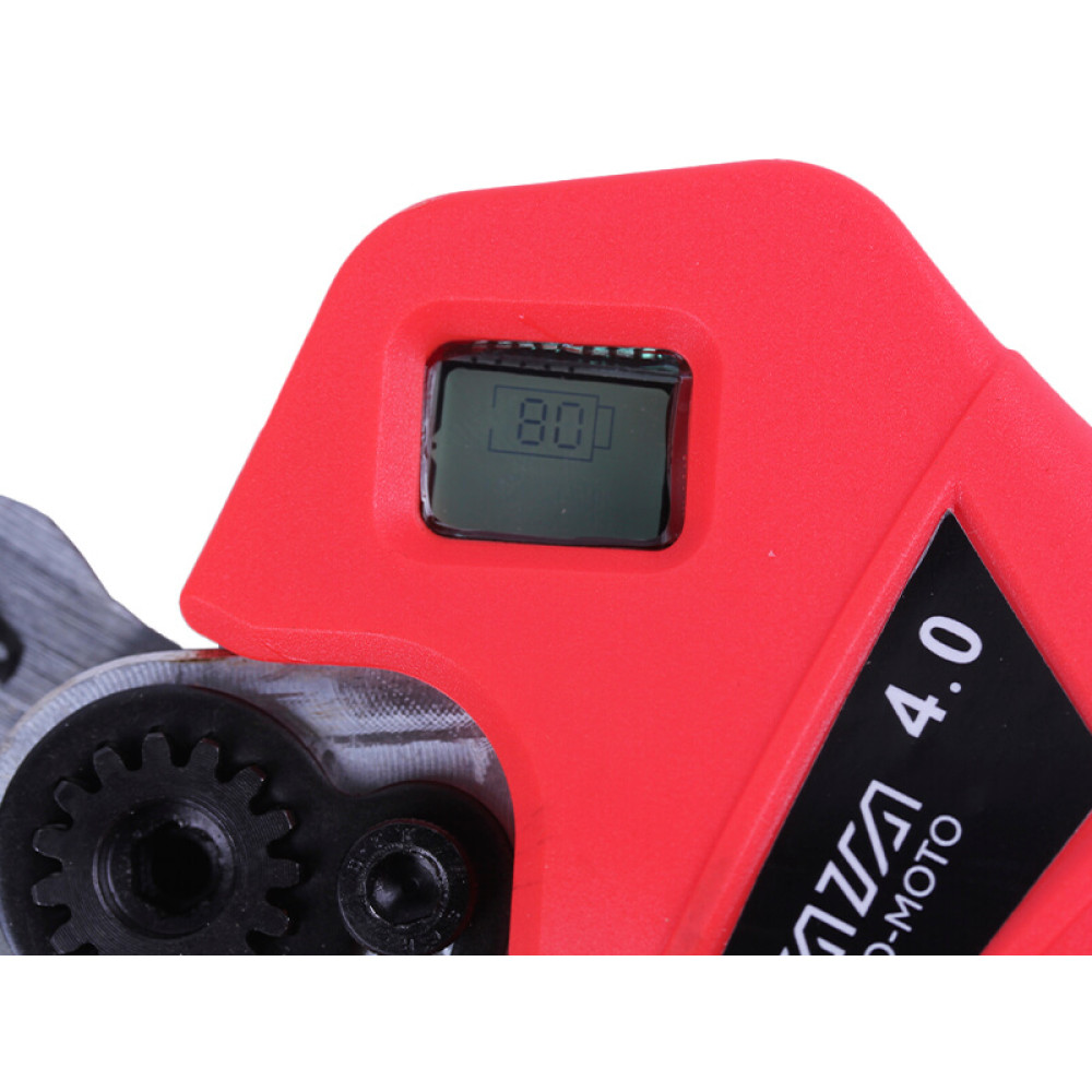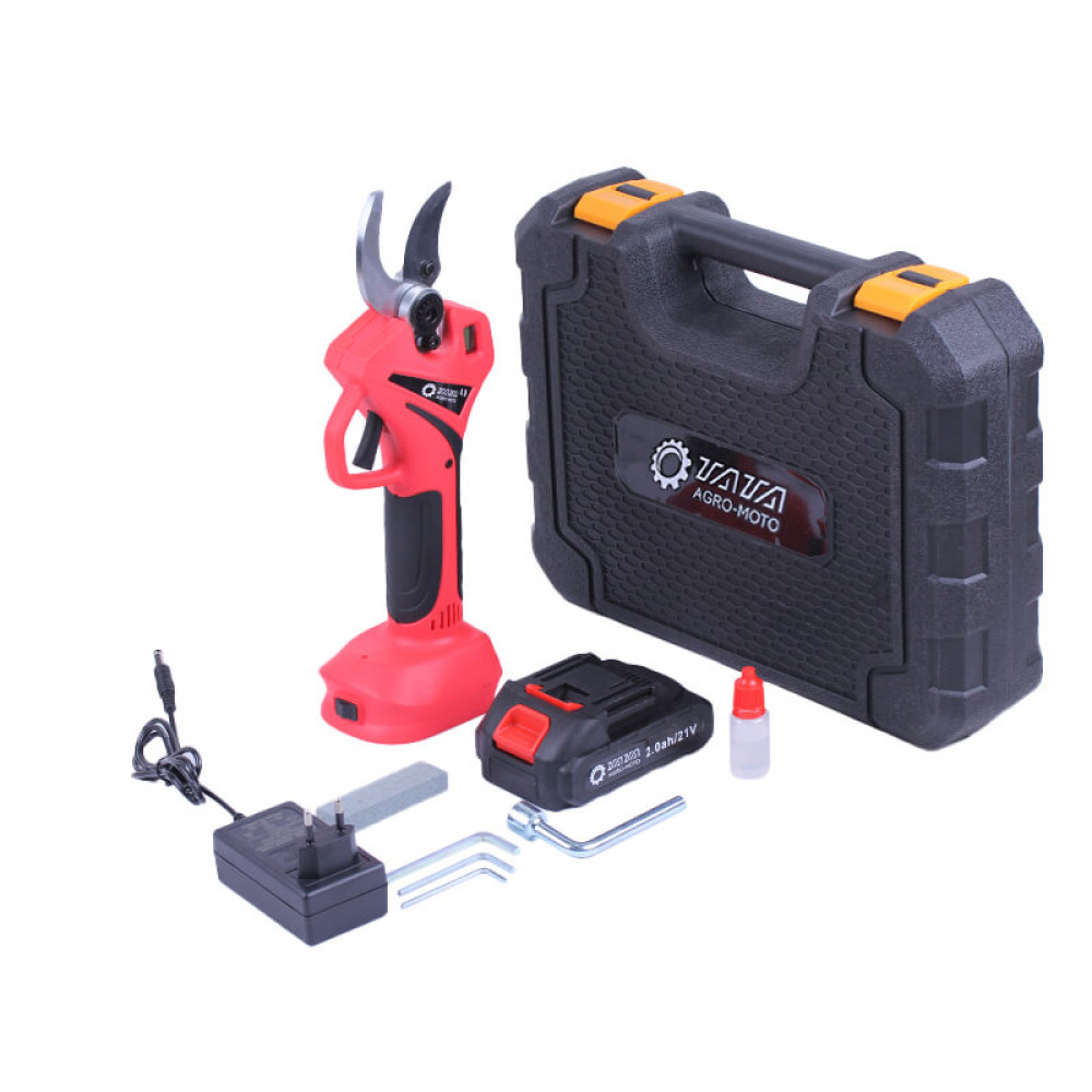 Пристрій комплектується міцним пластиковим кейсом, який забезпечує надійний захист секатора під час транспортування та зберігання. Надійні клямки запобігають відкриття кейсу, гарантуючи збереження інструменту. Комплект включає не тільки сам секатор, але і зарядний пристрій, акумулятор, а також набір для обслуговування, що включає ключі, абразивний камінь і ємність з маслом.