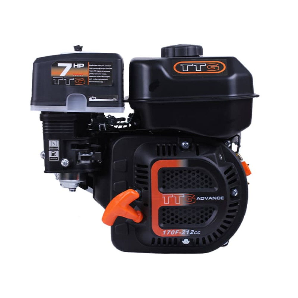 ДВИГУН 170F БЕНЗИНОВИЙ (ПІД ШПОНКУ Ø20 ММ) 7 К.С. TTG – ідеальне рішення для всіх видів сільськогосподарської та будівельної техніки. Завдяки чотиритактній конструкції OHV, повітряному охолодженню та горизонтальному валу під шпонку Ø20 мм, двигун забезпечує стабільну роботу навіть при тривалих навантаженнях та інтенсивному використанні. Його міцна конструкція і надійна система розбризкування масла гарантують довговічність та мінімальне технічне обслуговування.