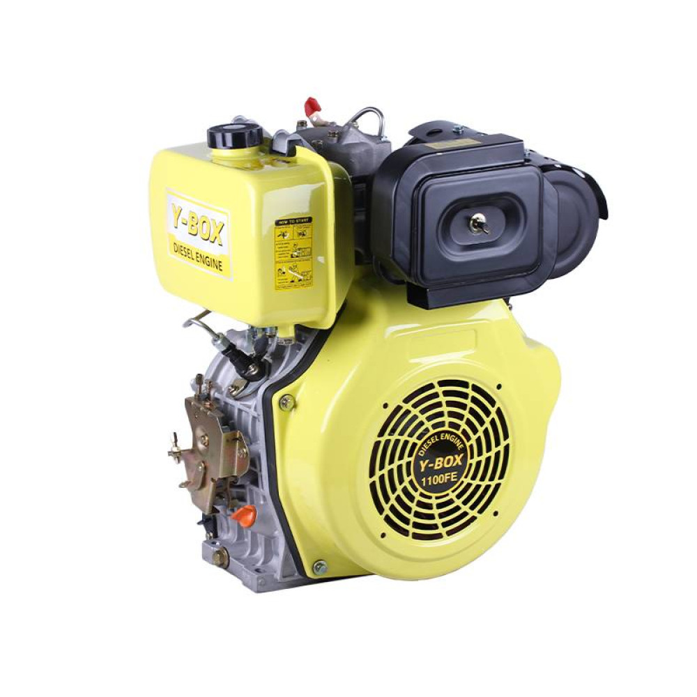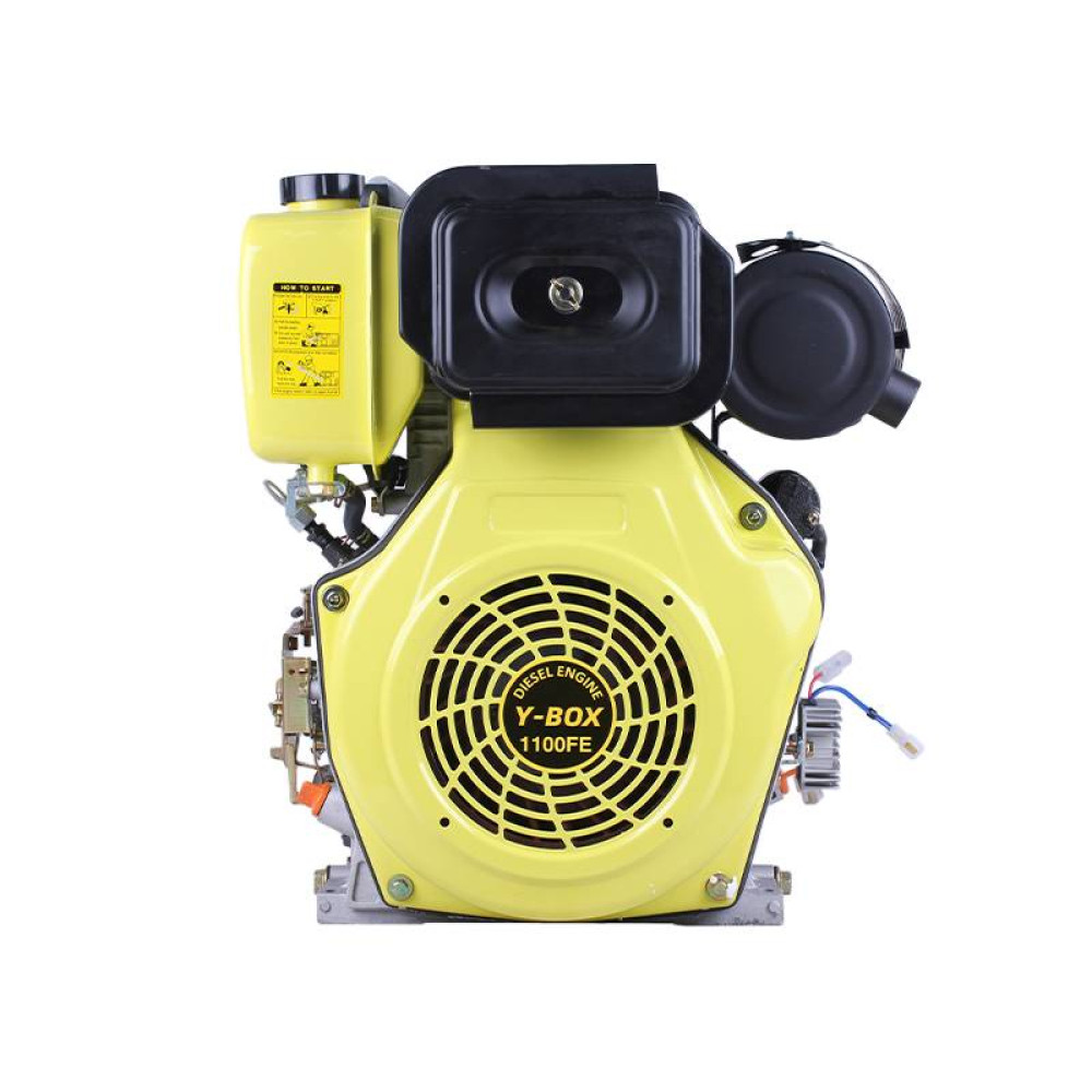 Застосування: дизельний двигун 1100FE YBX 15 кінських сил з електростартером та горизонтальним валом під шліци 25 мм ідеально підходить для мотоблоків, міні-тракторів, генераторів, насосів, віброплит та іншої сільськогосподарської і будівельної техніки. Він ефективно використовується для обробки грунту, оранки, посіву та прополки в аграрному секторі, а також для стабільної роботи насосів та генераторів у побуті та на фермах. В садово-парковому господарстві двигун допомагає у догляді за газонами, поливі та транспортуванні невеликих вантажів. Його універсальна конструкція та висока потужність дозволяють замінити старі мотори і модернізувати техніку, що потребує надійного, економного та довговічного дизельного двигуна.