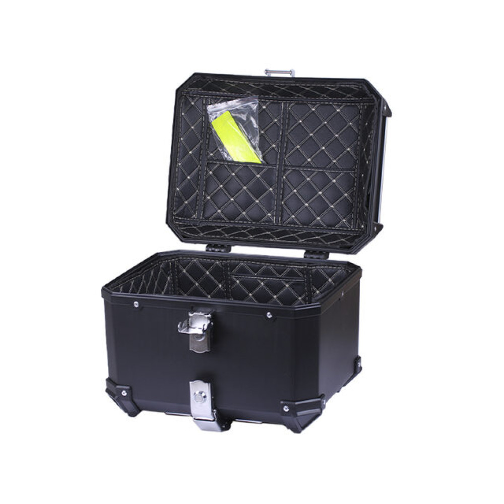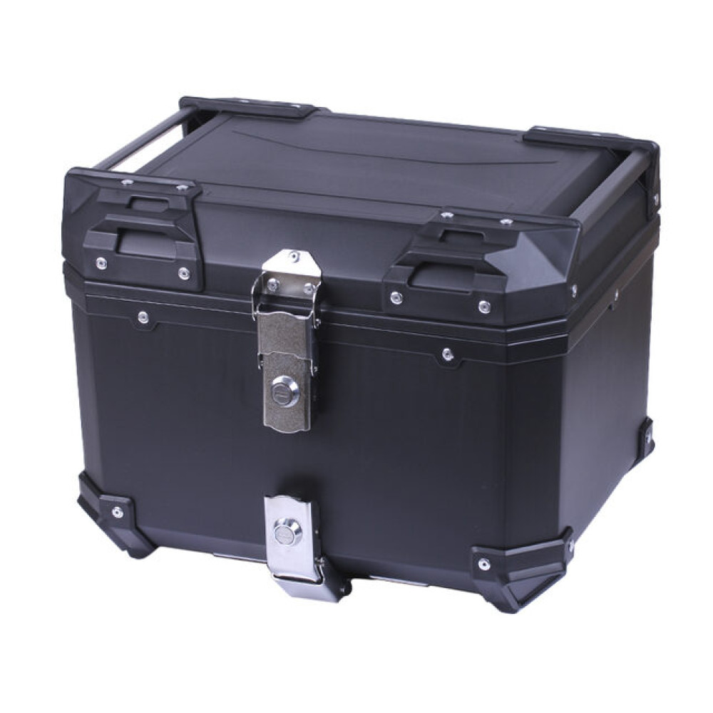 КОФР ПРЯМОКУТНИЙ ДЛЯ МОТОЦИКЛА ПЛАСТИКОВИЙ ЧОРНИЙ, ЗІ СПИНКОЮ ТА ДВОМА ЗАМКАМИ 45 Л — надійне та практичне рішення для зручного перевезення речей під час поїздок на мотоциклі. Цей місткий кофр 45 літрів виготовлений з міцного ABS пластику, забезпечує безпечне зберігання мотошолома, екіпірування та особистих речей. Завдяки двом замкам ваш багаж надійно зафіксований, а центральне встановлення гарантує комфорт і стабільність під час руху. Чорний колір робить дизайн універсальним та стильним для будь-якого мотоцикла.