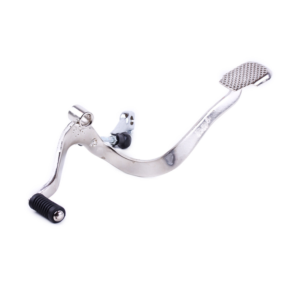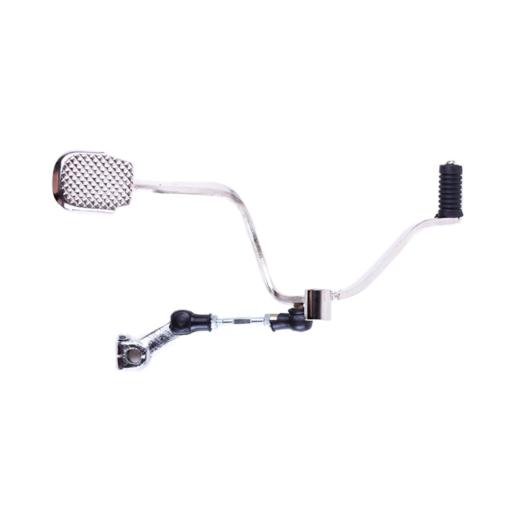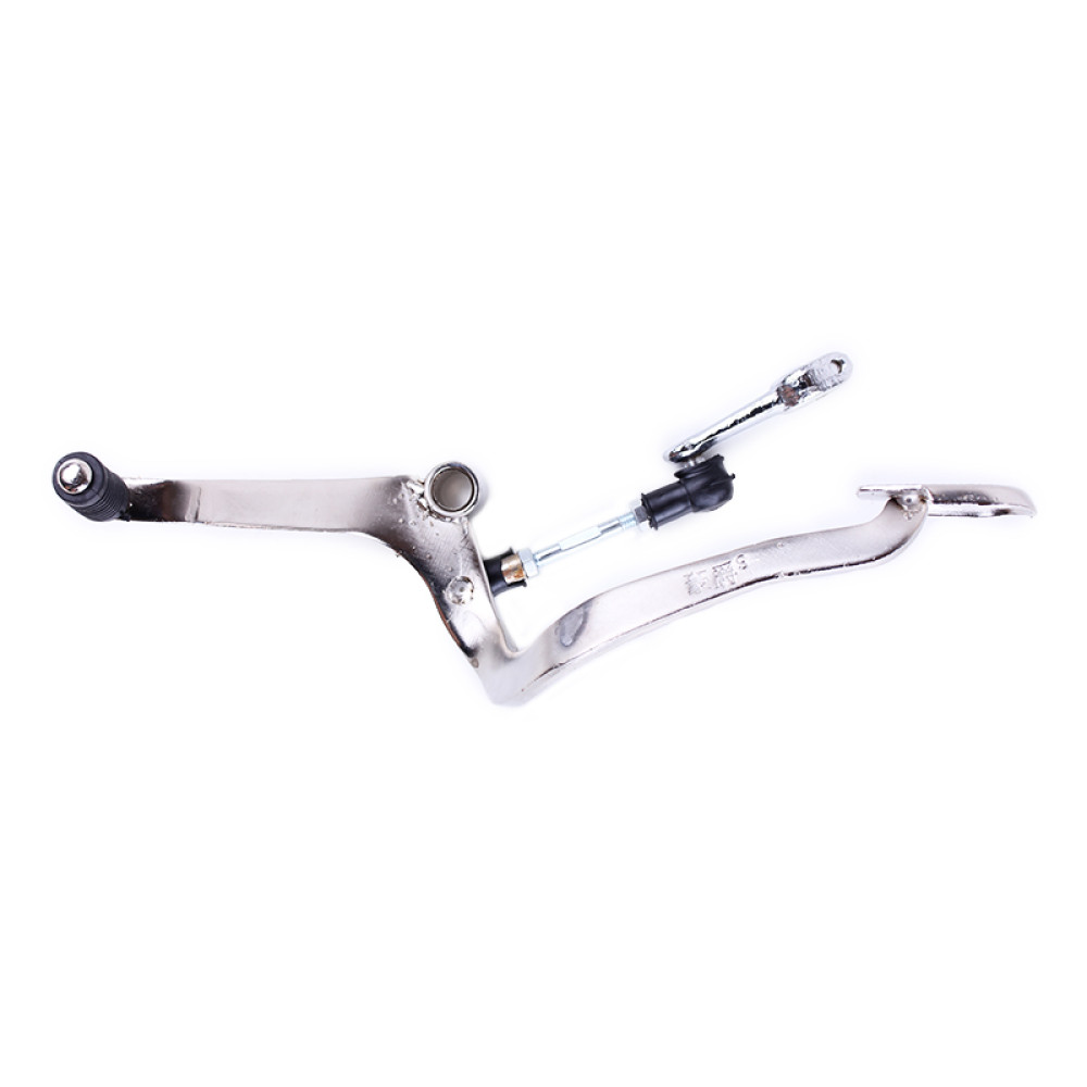 Ніжка перемикання передач з тягою - СВ-125/150 Довжина загальна (мм) - 300 Винос передньої лапки (мм) - 110 Винос лапки під п'яту (мм) - 190 Діаметр посадковий під вал (мм) - 12,5 Довжина тяги регульована центрам (мм) – 87 Довжина литої тяги по центах (мм) – 45 Діаметр під шліцевий вал (мм) – 11 Вага (гр.) – 465