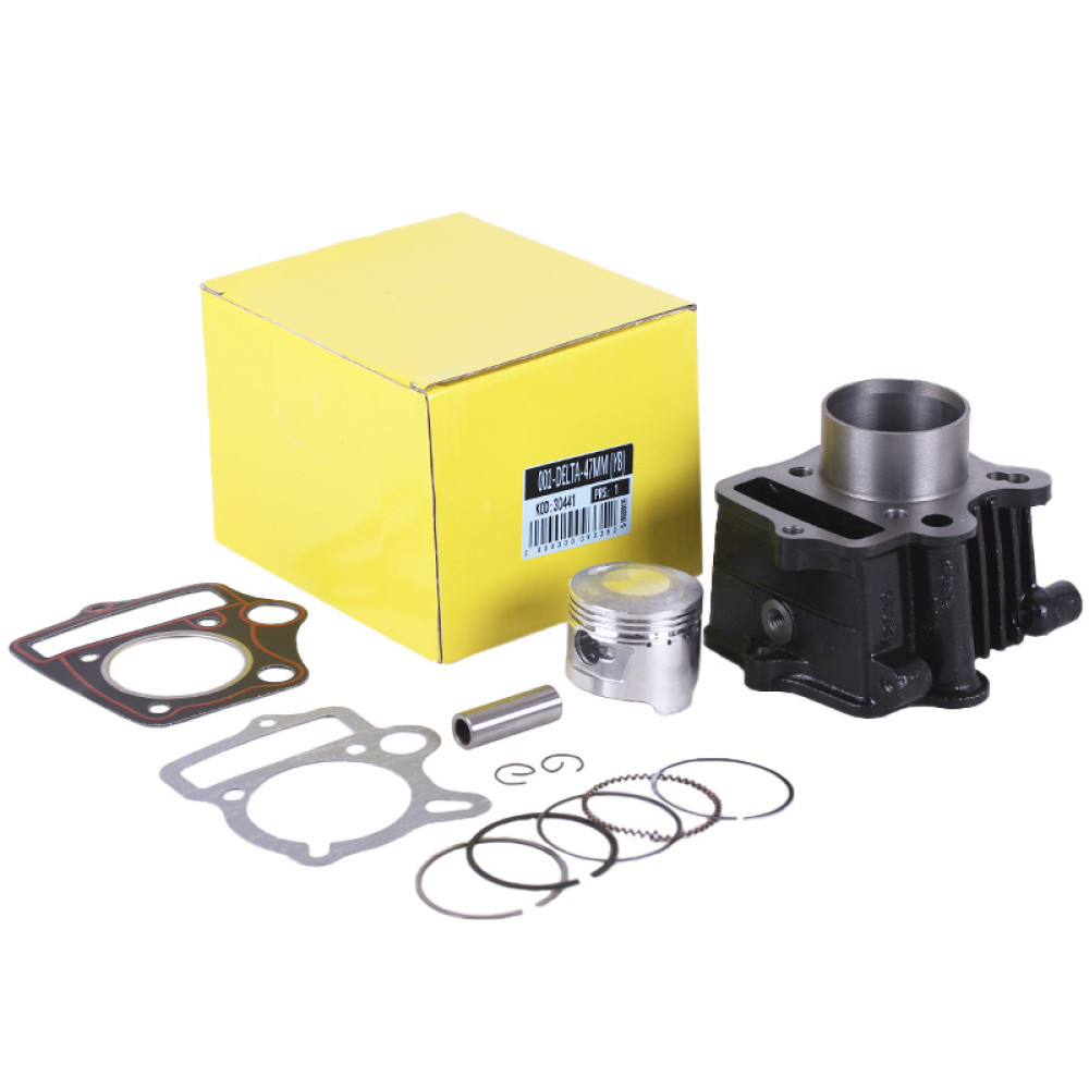 Поршнева (ЦПГ) 47 мм, к-т: 12 одиниць - 72СС - Дельта/Альфа Y-BOX Довжина гільзи (мм) - 89 Діаметр гільзи , внутрішній/зовнішній (мм) - 47/52.5 Міжболтове по центрах отворів (мм) - 50/49 Товщина компресійних кілець (мм) - 1 Товщина маслознімних кілець (мм) - 0.4 Діаметр пальця (мм) - 13 Довжина пальця (мм) - 38 Діаметр спідниці поршня (мм) - 47 Висота поршня (мм) - 4 пальця до верху поршня (мм) – 11 Вага (гр.) – 1685