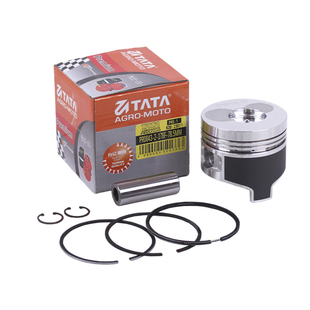 Поршневий комплект 78,5 мм STD ТАТА Premium гострий конус форкамери, 8 одиниць призначений для дизельних двигунів 178F потужністю 6 к.с. з повітряним охолодженням. Включає поршень, палець, кільця, стопорні кільця. Технічні характеристики деталей комплекту: загальна висота 70 мм; • відстань від верху поршня до пальця 24 мм; • маса комплекту 500 г. Поршневий комплект 78,5 мм STD 178F ТАТА Premium підійде на мотопомпи, подрібнювачі гілок, віброплити, мотоблоки та іншу техніку моделей Витязь (ТАТА) HT105, HT105E, Зубр (Zubr) HT XA-031, Вейма (Weima) WM1100А, WM1100АE, Аврора 105, 105E, Форте (Forte) 2081Д, Кама 610, 610С, 610CE, 610L, Зоря SH-135, SH-135E, Добриня MT-105E, MT-105, HT-105, HT-105E, Булат (Bulat) BT1100Д, C0 МК-105ЗД та інші. Наш інтернет-магазин пропонує купити поршневий комплект 78,5 мм STD ТАТА Premium гострий конус форкамери, 8 їжі