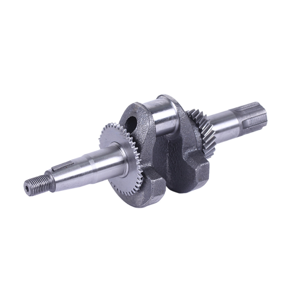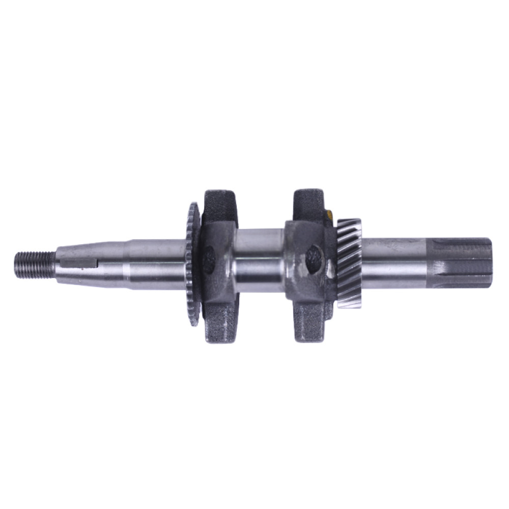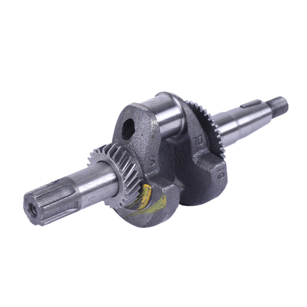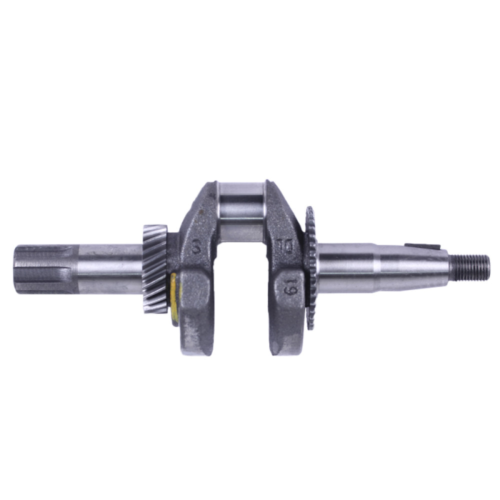 Коленвал в сборе ТАТА 168F под шлицы 25 мм предназначен для установки на бензиновые двигатели мощностью 6,5-7 л.с. с воздушным охлаждением. Основные технические характеристики коленвала в сборе ТАТА 168F под шлицы диаметром 25 мм: • длина общая 240 мм; • узкая шестерня 39 зубцов; • широкая шестерня 24 зубца; • диаметр шатунной шейки 30 мм; • масса узла 1,76 кг. Размеры шлицевой части: • длина выступающей части 50 мм; • диаметр 20, 25 мм; Подходит на виброплиты, мотоблоки, культиваторы, дробилки и прочую рабочую технику моделей Витязь (ТАТА) SR1Z-750, SR1Z-90, SR1Z-80, SR1Z-100, Вейма (Weima) WM500, WM1050, WM1100C, Садко (Sadko) M500, M800L, M1165, M-400, M-450, M-900, Форте (Forte) 105G, HSD1G-80B, Зирка (Zirka) LX2060G, LX2061G, LX2062G, LX3060G, GT70G01, MF360, Зубр (Zubr) Z-19, GN-2, GN-4, KX-3, PS-Q70, Кентавр 2060Б, 2061Б, 2070Б, 2075Б, 2080Б, 2081Б, МБ-40-1, МБ-2070Б-3, МБ-3060Б, Нева МБ-2К, Заря SH-2, SH-41S, Добрыня T-41, MT-65, Булат (Bulat) BT900, BT1100C, Бригадир МК-75Б, МК-80Б, МК-105РБ и др. В
