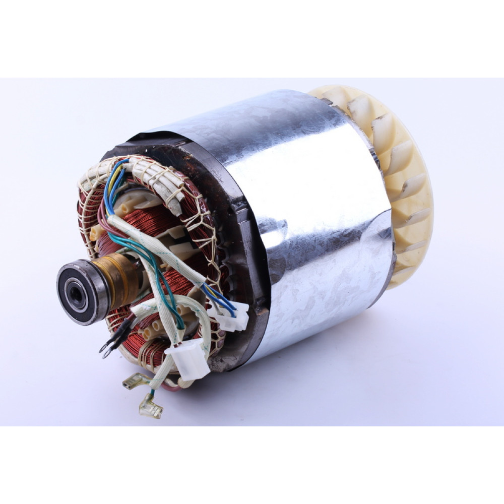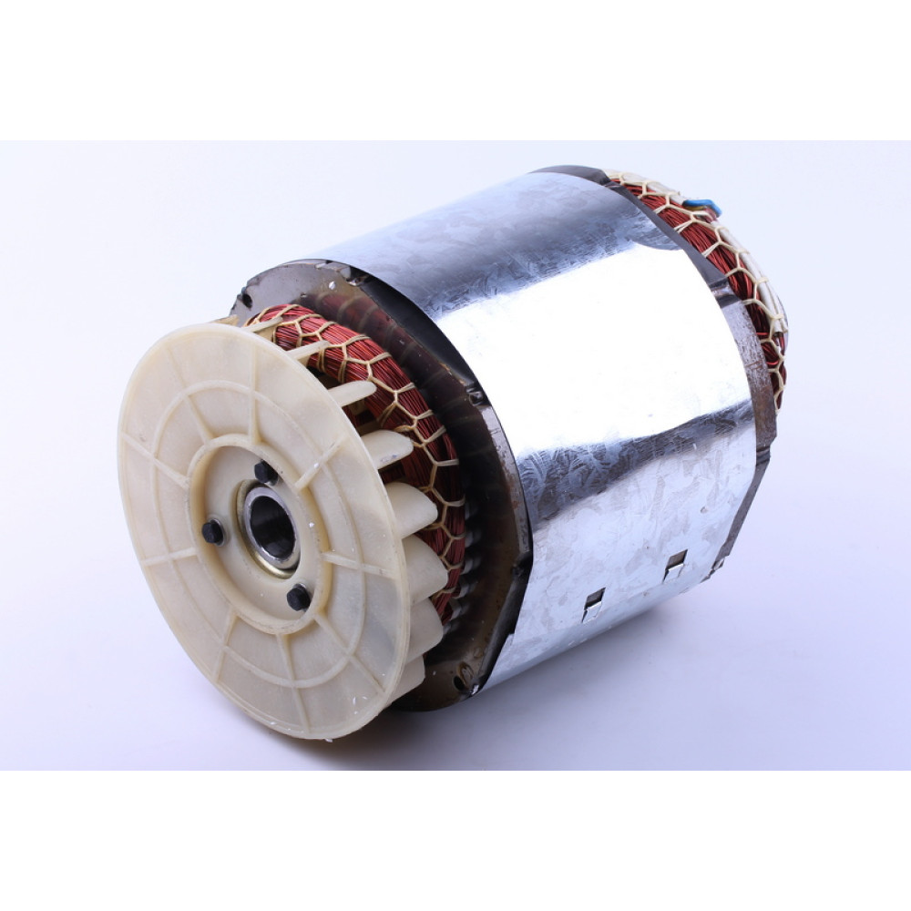 Статор у зборі з ротором – блок запчастин, призначений для перетворення механічної енергії в електричну. Важливою перевагою даної моделі є мідна обмотка, яка забезпечує генератору високу зносостійкість. Застосування Вказаний статор із ротором застосовується на однофазні агрегати, які мають потужність 5-6 кВт. Принцип роботи Статор - нерухома частина агрегату. Він є металевим сердечником, що складається з декількох пластин. Вони ізольовані між собою та зібрані в єдину конструкцію. На пази із внутрішньої сторони статора встановлюються котушки обмоток. На останніх утворюється змінний електричний струм завдяки взаємодії з ротором. Ротор - частина генератора, що обертається, являє собою електромагніт, який збуджує в статорі змінне магнітне поле. Він складається з валу, що містить обмотку збудження, яка розміщена в двох полюсних половинах. На валу ротора розташовані контактні металеві кільця, якими реалізується живлення обмотки збудження. До них припаюються виводи обмотки збудження. Генератор функціонує тоді, коли механічна енергія обертання ротора перетворюється на електричну шляхом обертання ротора в магнітному полі. Переваги даної моделі Основними перевагами зазначеного блоку елементів генератора є: