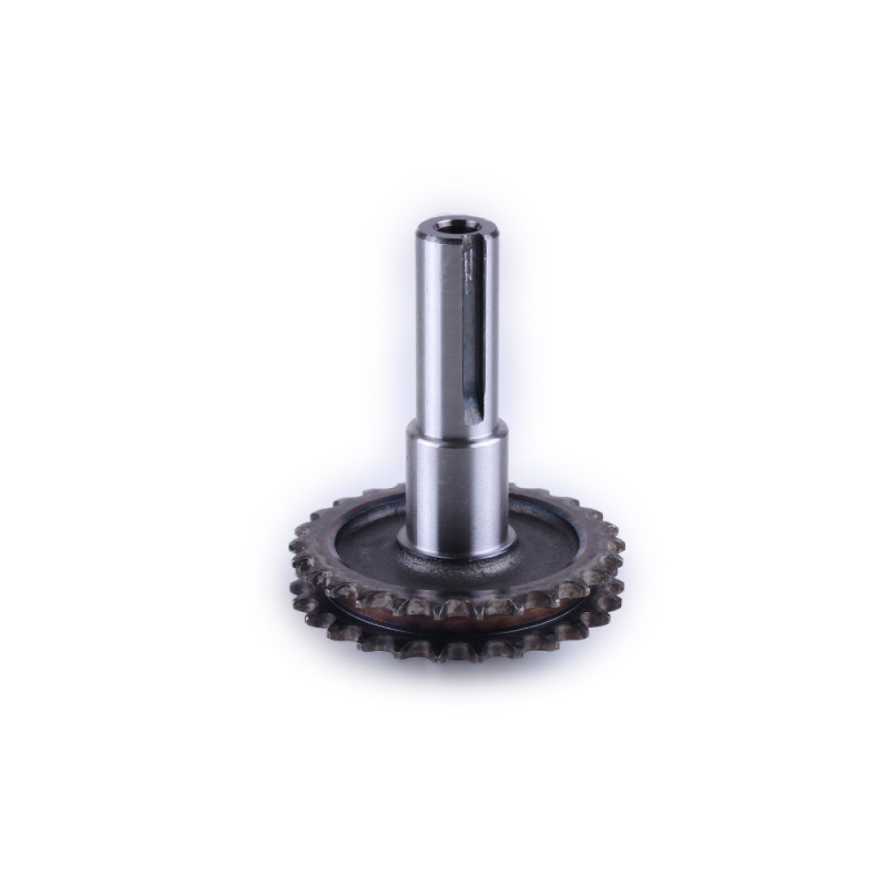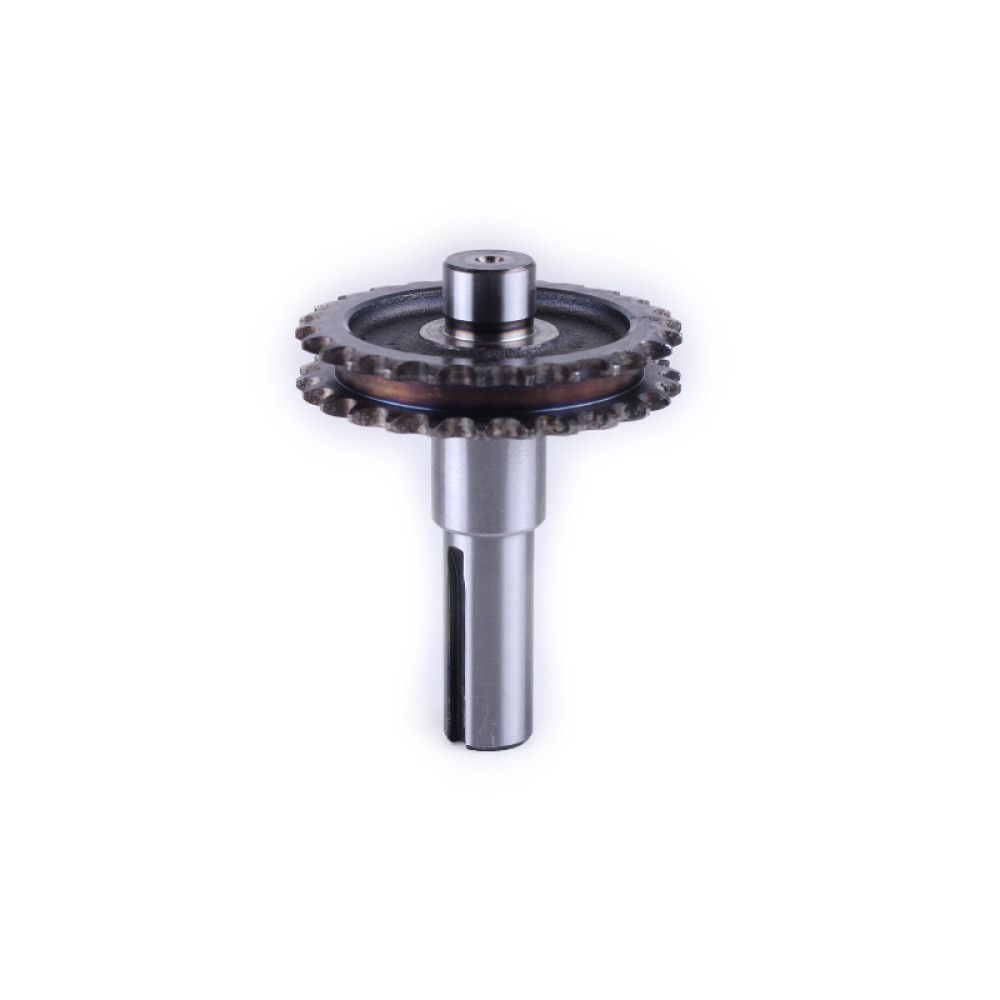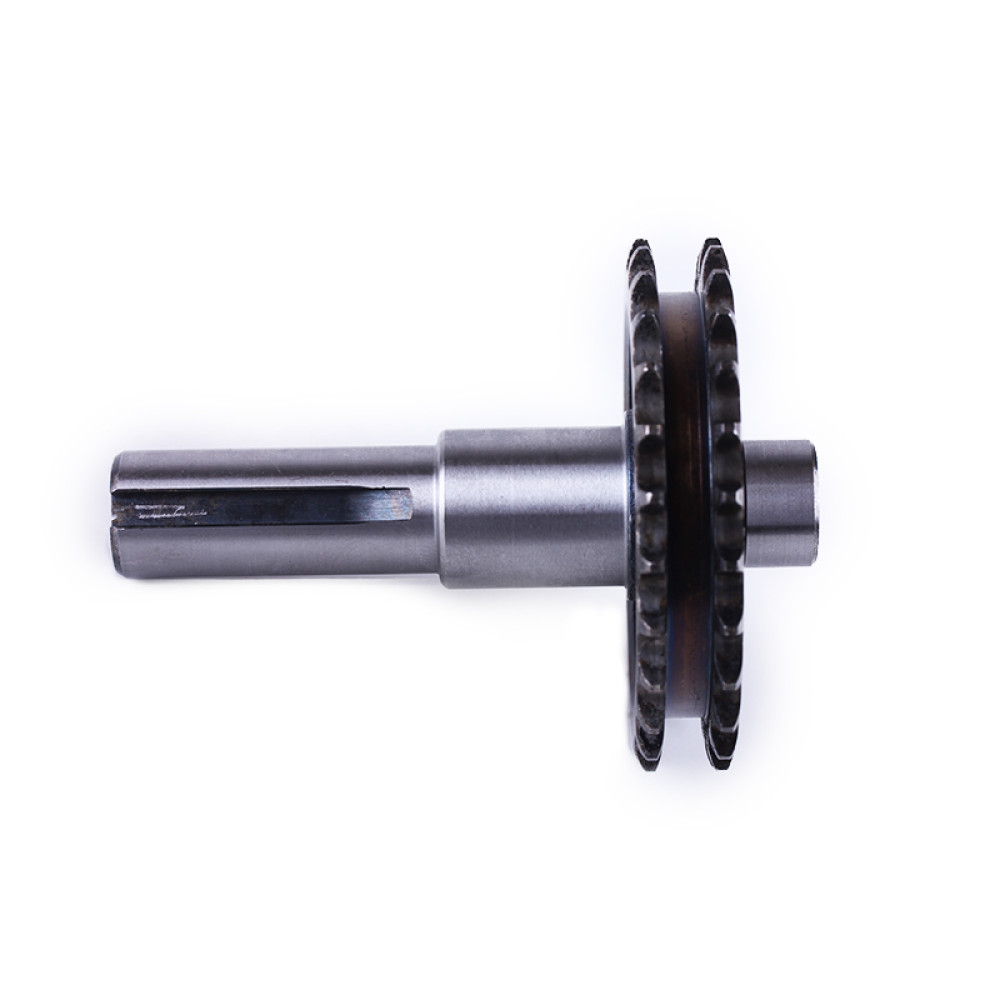 Вал із зіркою понижуючого редуктора Z-26 - 168F Довжина валу (мм) - 108 Діаметр під шпонку (мм) - 20 Ширина шпонки (мм) - 5 Діаметр під підшипники (мм) - 20 / 25 Діаметр внутрішньої різьби - М8 Діа (мм) - 82 Ширина дворядної зірочки (мм) - 15,5 Кількість зубів (шт.) - 26 Вага (гр.) - 590