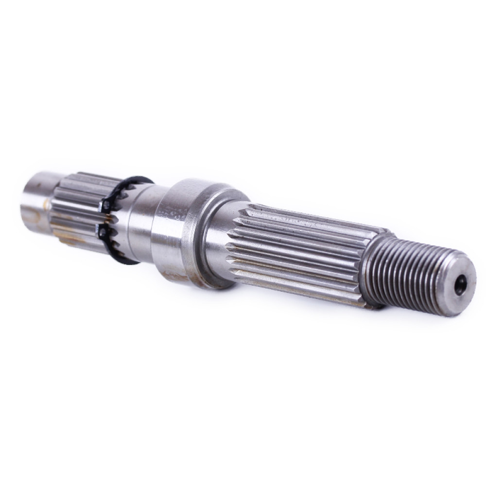 Вал редуктора вторинний (короткий) - 125/150CC Довжина (мм) - 134 Діаметр шліцевий (мм) - 20 Діаметр під підшипник (мм) - 17 Кол - у шліців (шт.) - 19 Різьблення - М16 Вага (гр.) - 310